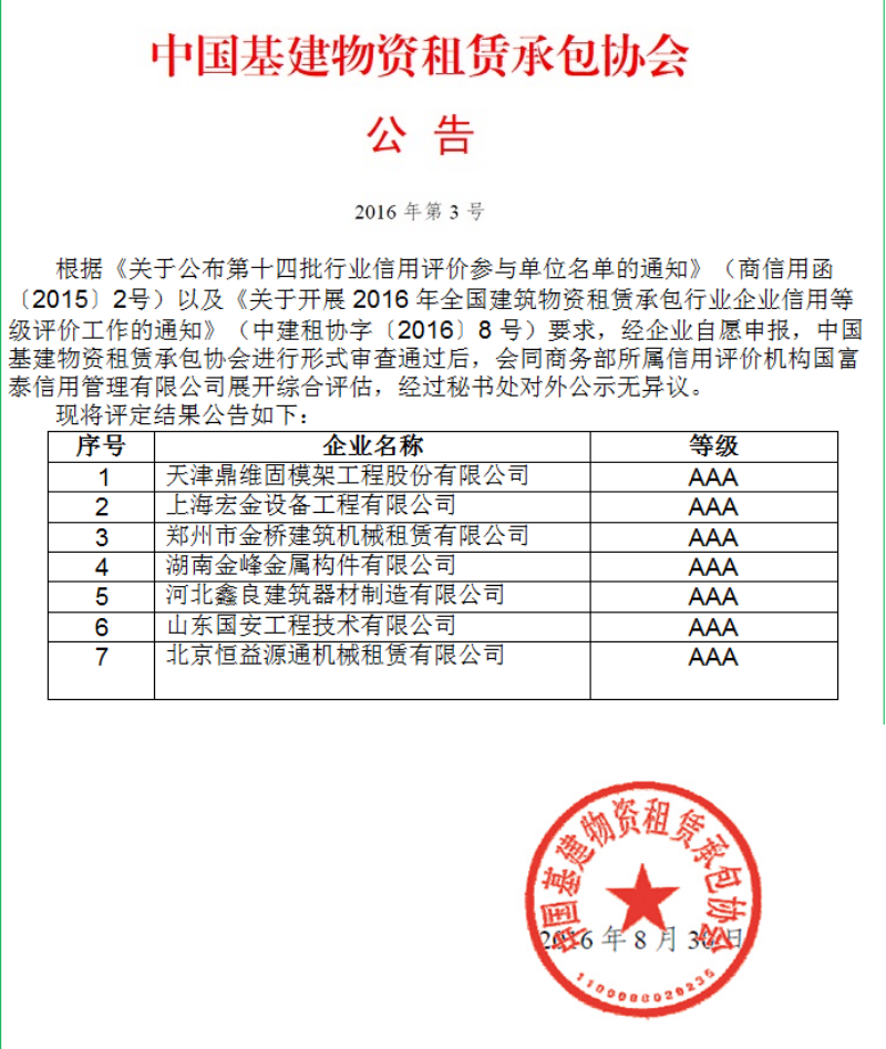 之后,協(xié)會宣布了通過評定的全國建筑物資租賃承包行業(yè)第一批信用評級3A企業(yè),我公司——北京恒益源通機械租賃有限公司——也榮登此榜單,獲得又一新的榮譽,協(xié)會領導為3A級企業(yè)頒發(fā)了獎牌與榮譽證書。